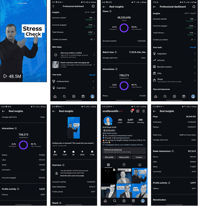 The campaign generated high-ticket leads with a $20,000 average order value and drove 700+ qualified leads to the website. It also produced massive reach, with top-performing content generating more than 50 million views and other campaigns reaching 10 million, 7 million, and millions more. At the same time, the strategy improved brand recognition and trust, helping position Scott as an industry authority Beyond lead generation, the campaign elevated Scott’s personal brand in a crowded market. Consistent messaging, recognizable visual identity, and high-performing content helped build trust and authority with the right audience.